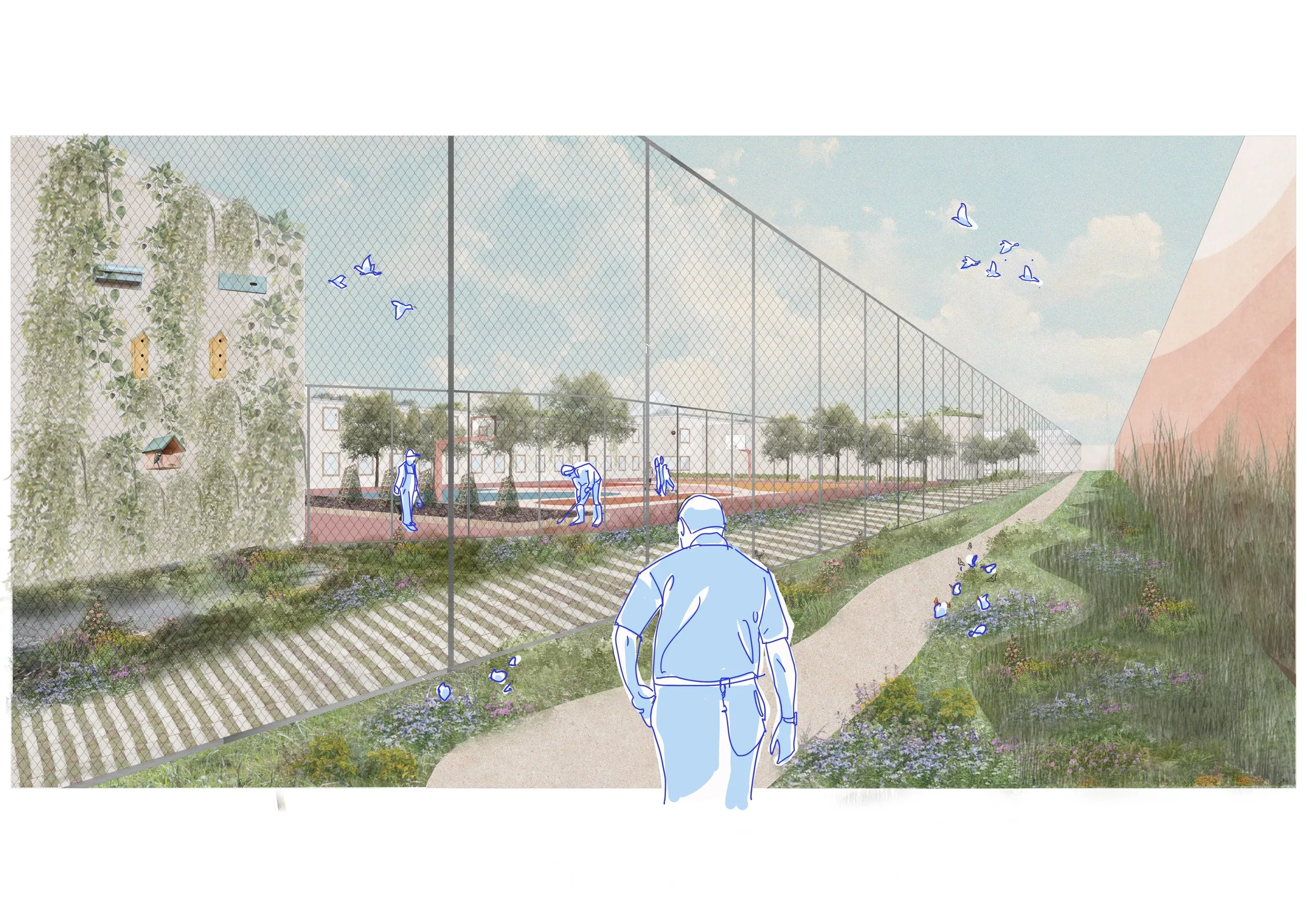 De buitenruimtes van Nederlandse penitentiaire inrichtingen zijn lange tijd vooral ontworpen vanuit één dominante logica: veiligheid. Luchtplaatsen en omliggende zones zijn daardoor vaak functioneel, sterk verhard en prikkelarm ingericht. Begrijpelijk vanuit beheersbaarheid en risicovermijding, maar steeds minder passend bij actuele inzichten over welzijn, veiligheid, duurzaamheid en werkbaarheid. Samen met de Dienst Justitiële Inrichtingen (DJI) en het Rijksvastgoedbedrijf (RVB) onderzochten we hoe deze buitenruimtes — met de luchtplaats als vertrekpunt — kunnen bijdragen aan een meer humane, rustige en toekomstbestendige detentieomgeving, zonder afbreuk te doen aan veiligheid.