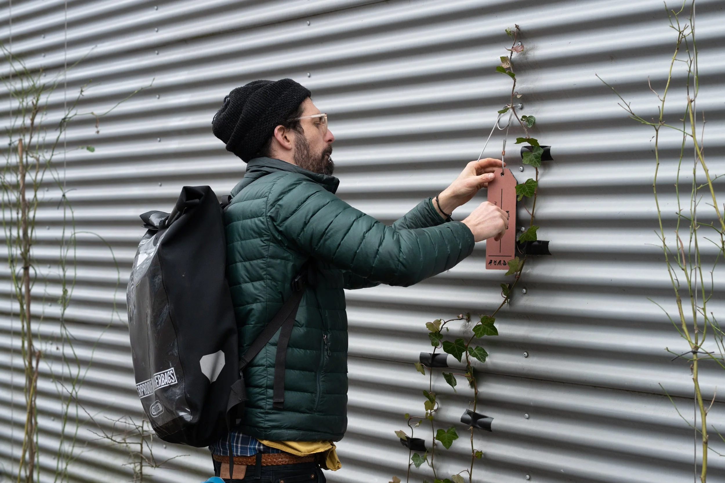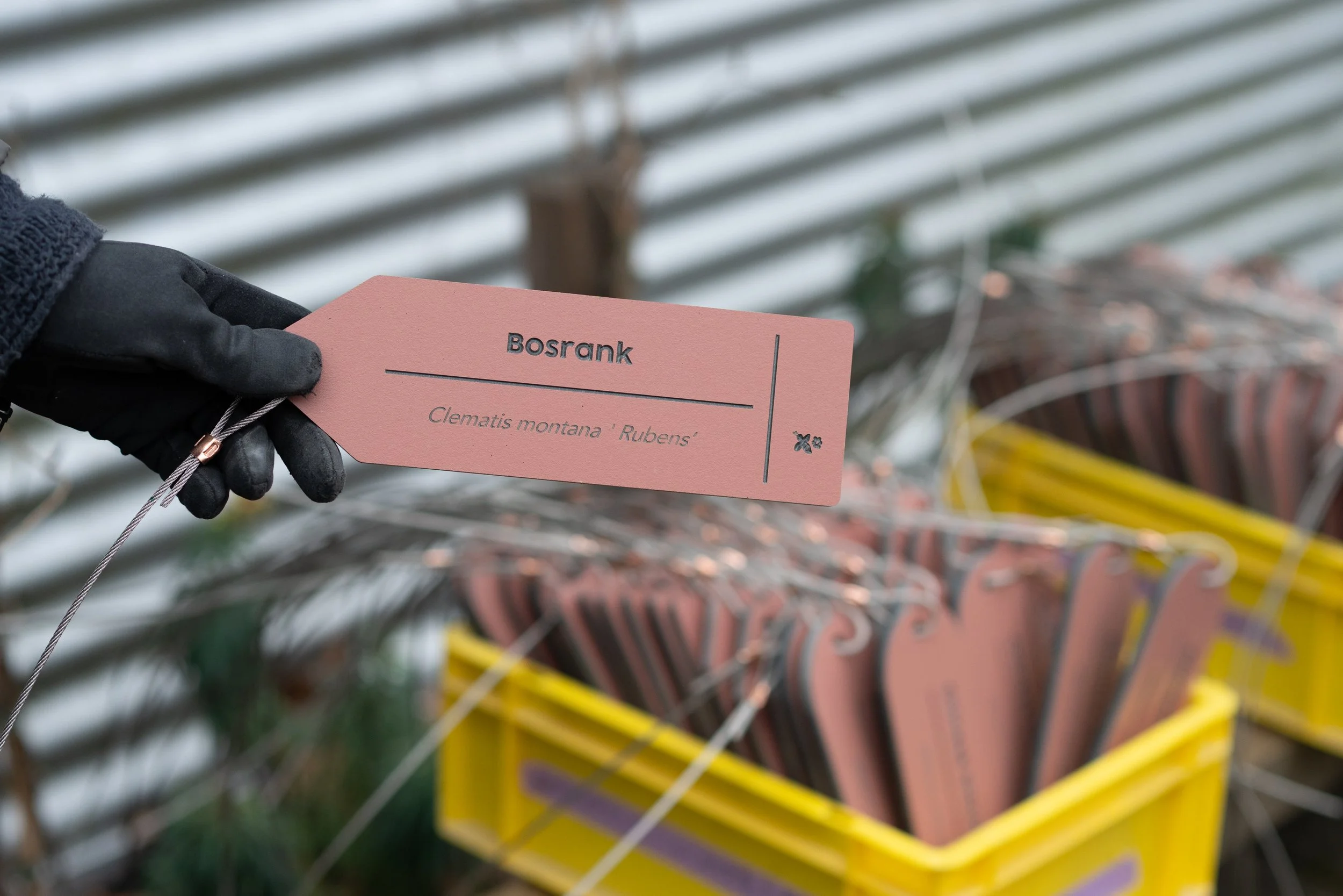 Om het idee achter de gids — leren over planten en hun ecologische waarde — ook in het Muurbos tastbaar te maken, hebben we een systeem van circulaire signing ontwikkeld. Voor elke klimplant is een label gemaakt, CNC-gefreesd uit hergebruikte Trespa-gevelplaten. Op deze labels staan de Nederlandse en Latijnse naam, samen met de belangrijkste ecologische eigenschappen: of de soort inheems is, wintergroen blijft en of deze voedsel of habitat biedt voor vogels en insecten.