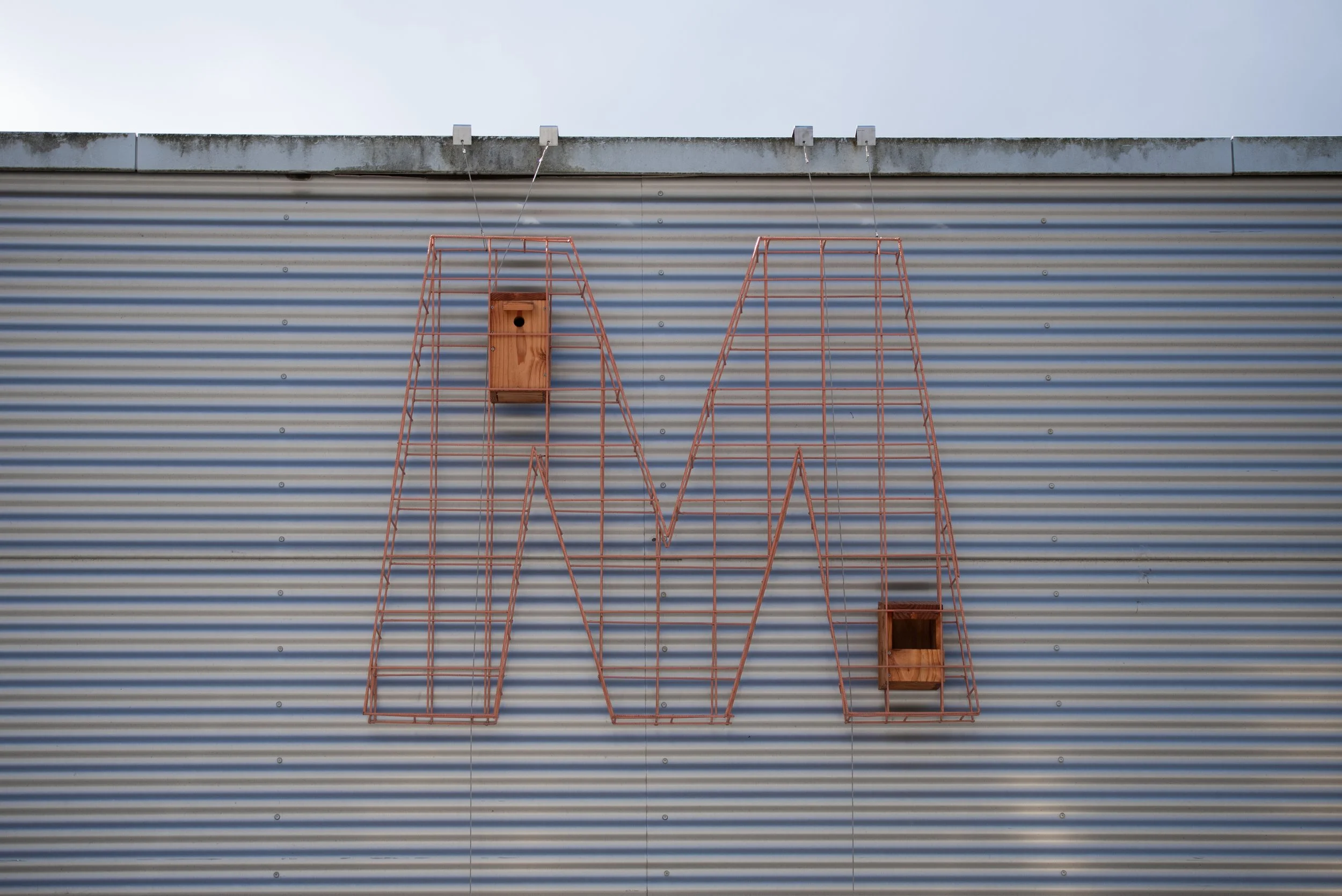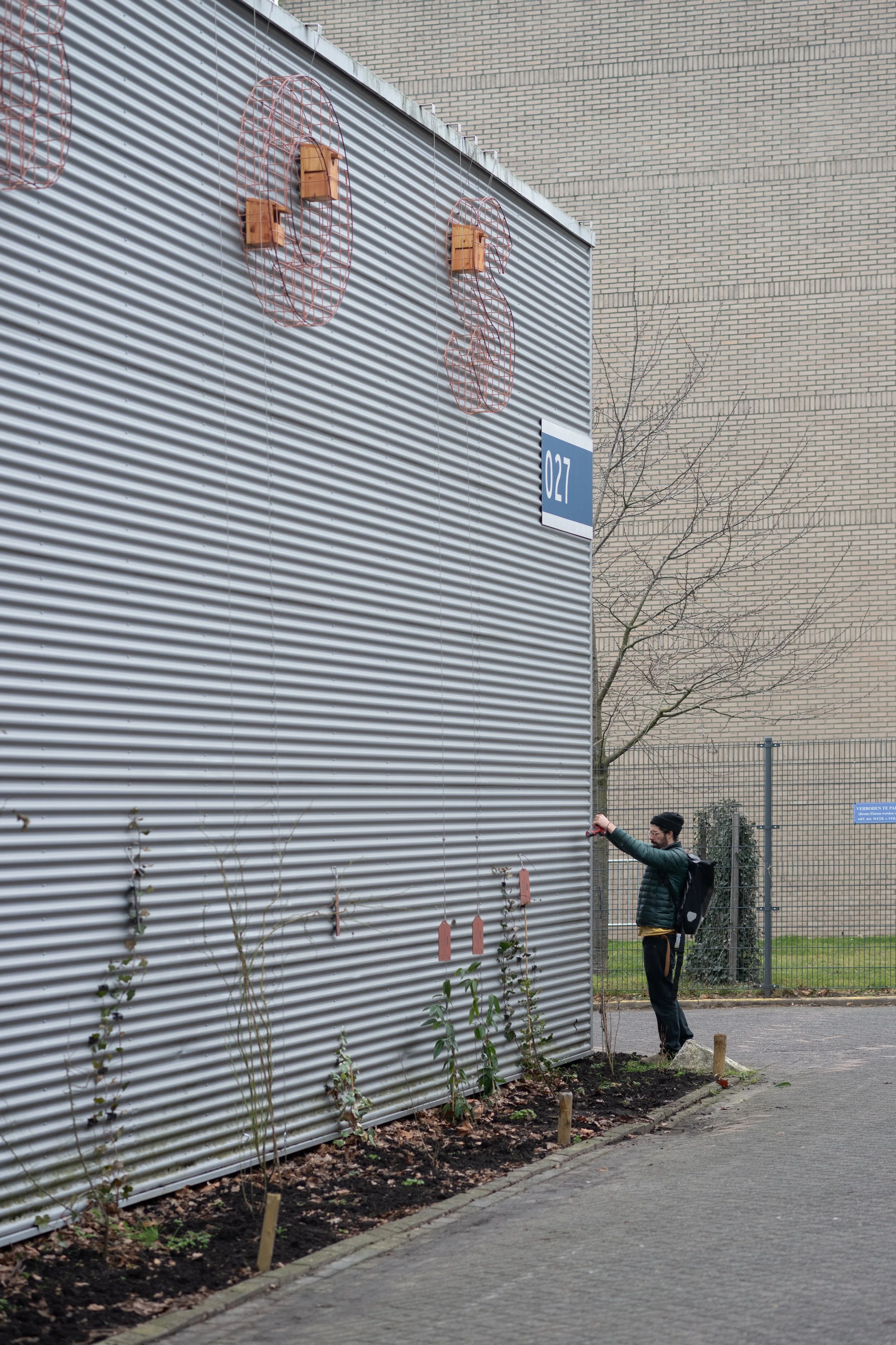 Daarnaast hebben we letters gelast van hergebruikte stalen matten, waarin nestvoorzieningen zijn geïntegreerd. Deze structuren worden op termijn overgroeid door de klimplanten, waardoor verblijfplaatsen ontstaan voor vogels zoals gierzwaluwen, huismussen, mezen en andere soorten.