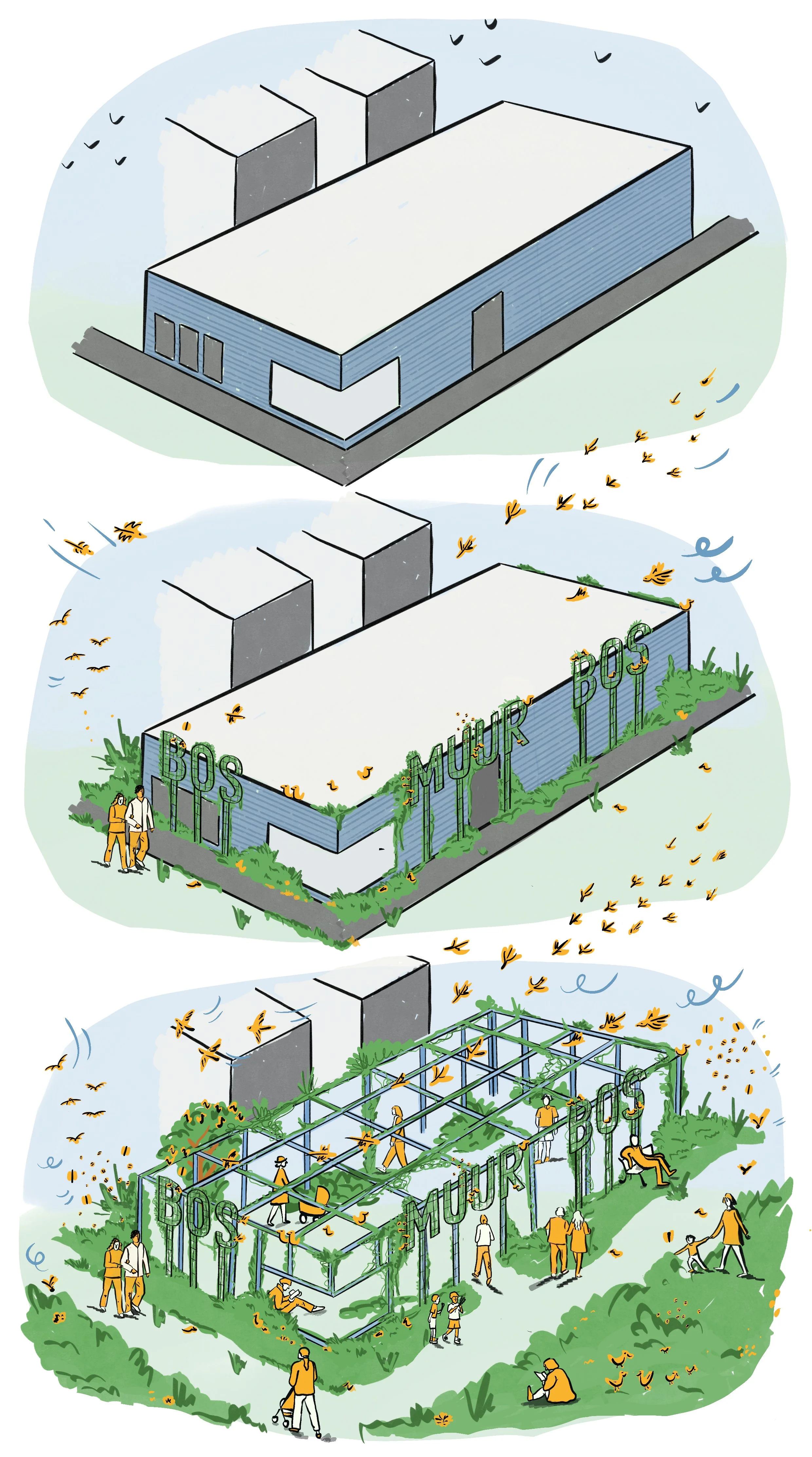 De klimplanten groeien langs kabels die per kolom van het gebouw zijn aangebracht. In de toekomst zien we voor ons dat de gevels worden verwijderd, terwijl het staalskelet blijft staan en transformeert tot een enorme pergola — mogelijk de grootste van het land — waarlangs de klimplanten verder groeien. Dit proces is verbeeld in de afbeelding hiernaast.